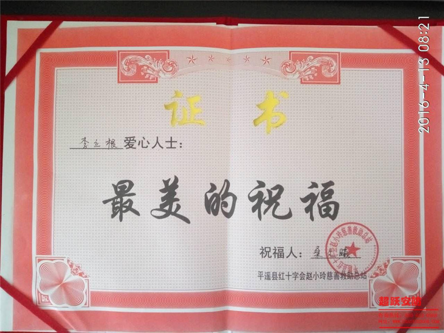 2016年山西超躍安防董事長李立根先生參加平遙縣紅十字會趙曉玲慈善救助,而被救助人回饋給李董事長愛心人士證書,大愛在人間。讓我們對愛心人士點個贊!!!